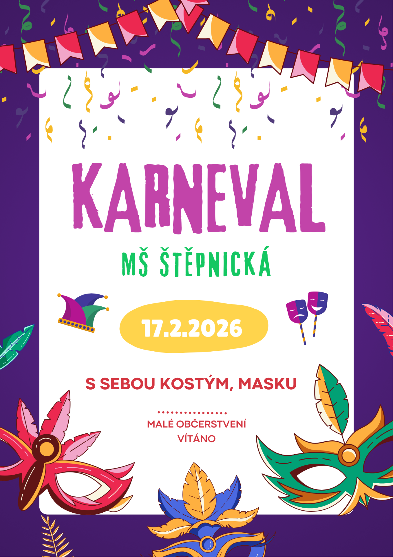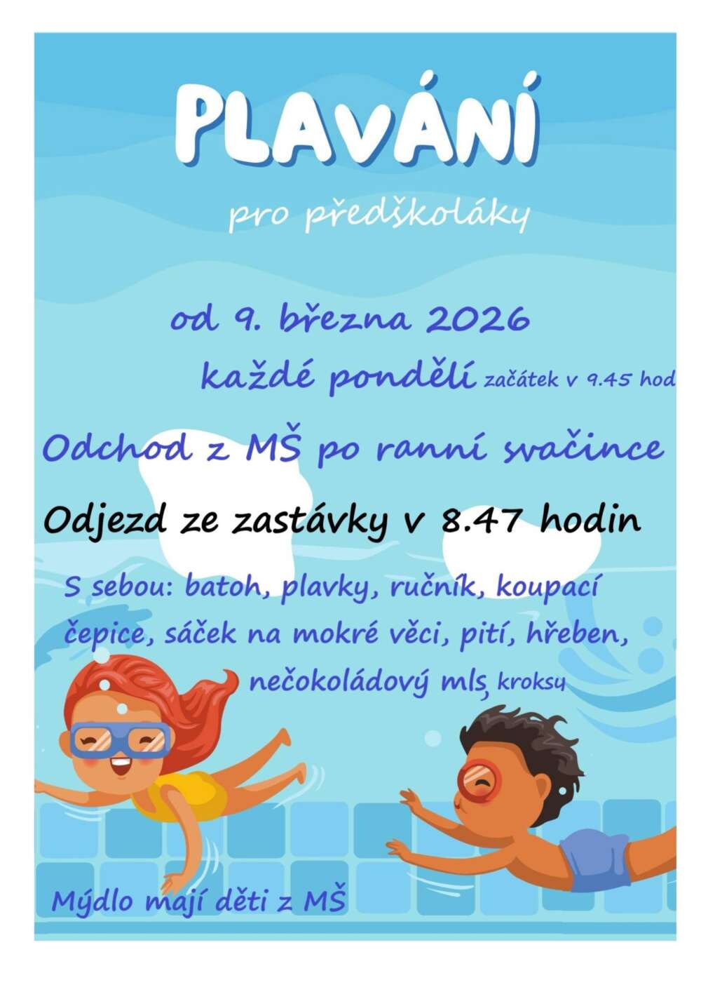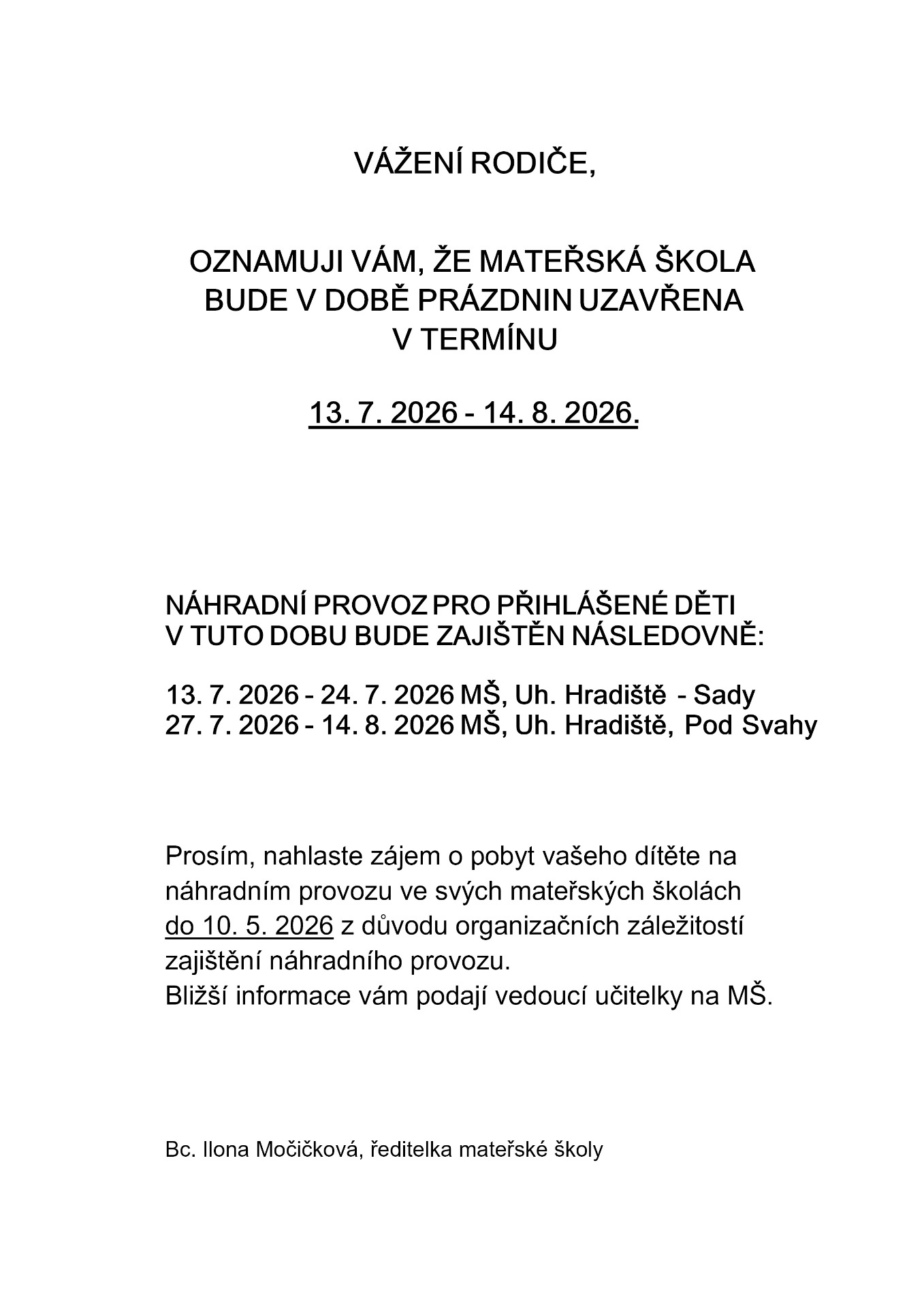 Prosíme rodiče, kteří mají zájem od příštího školního roku 2026/2027 přeřadit své dítě na jinou MŠ v rámci subjektu, aby tuto informaci sdělili nejpozději do 27. 2. 2026 vedoucí učitelce.
